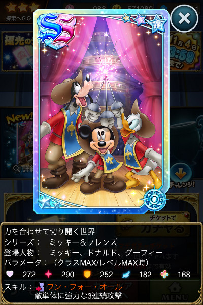 ストーリー:ミッキー&フレンズ キャラクター:ミッキー、ドナルド、グーフィー スキル:ワン・フォー・オール 効果:敵単体に強力な3連続攻撃