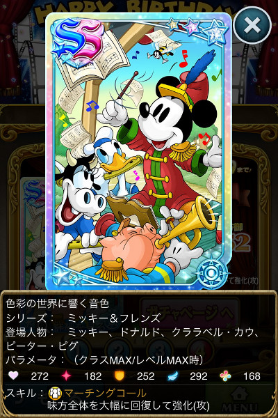 ストーリー:ミッキー&フレンズ キャラクター:ミッキー、ドナルド、グーフィークララベル・カウ、ピーター・ピグ スキル:マーチングコール 効果:味方全体を大幅に回復して強化(攻)